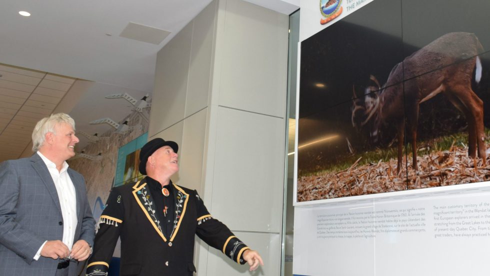PATRIMOINE. Le président et chef de la direction de l’Aéroport international Jean-Lesage de Québec (YQB), Stéphane Poirier, et le grand chef de la Nation huronne-wendat, Konrad Sioui, ont procédé ce