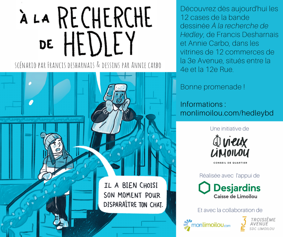 À l’initiative du conseil de quartier du Vieux-Limoilou, douze vitrines de la 3e Avenue, dans le Vieux-Limoilou, hébergent les cases de la bande dessinée À la recherche de Hedley. Les passants pourront découvrir cette création de Francis Desharnais et Annie Carbo au fil d’une promenade dans le quartier.