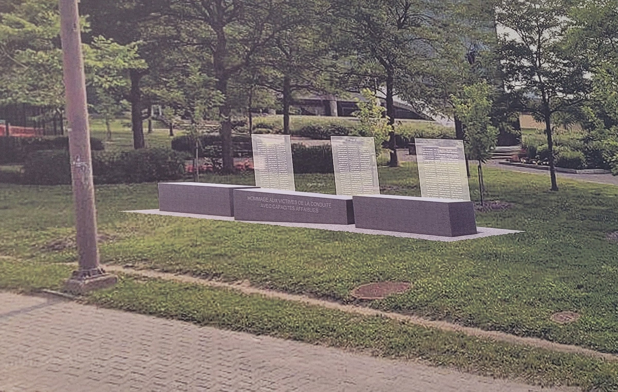 MÉMOIRE. À l’initiative de MADD Canada, un hommage perpétuel sera rendu à Québec en mémoire des victimes de la conduite avec capacités affaiblies. Le monument commémoratif consistera en trois colonnes translucides sises sur une ligne brisée en granite rappelant le trajet de vie interrompu par une collision routière. Il sera installé au début de l’été dans le parc de l’Amérique latine, voisin du palais de justice.