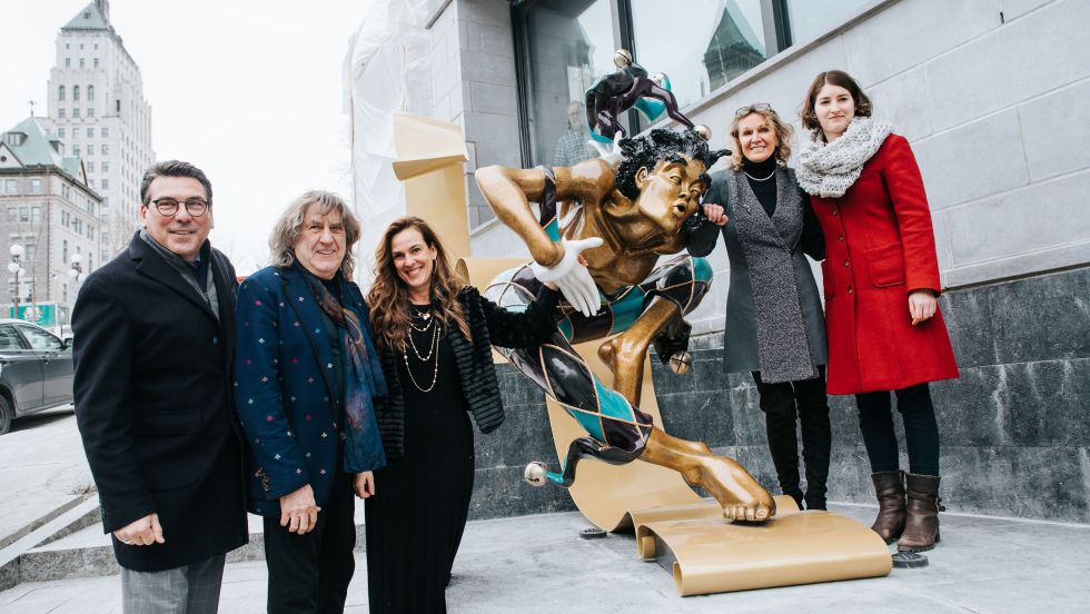 Les promoteurs Geneviève Marcon et Jean Campeau, en compagnie de l’artiste-conceptrice, Nicole Taillon, ont procédé au dévoilement officiel de la sculpture de bronze Le Grand Bienvenue récemment, au coeur du