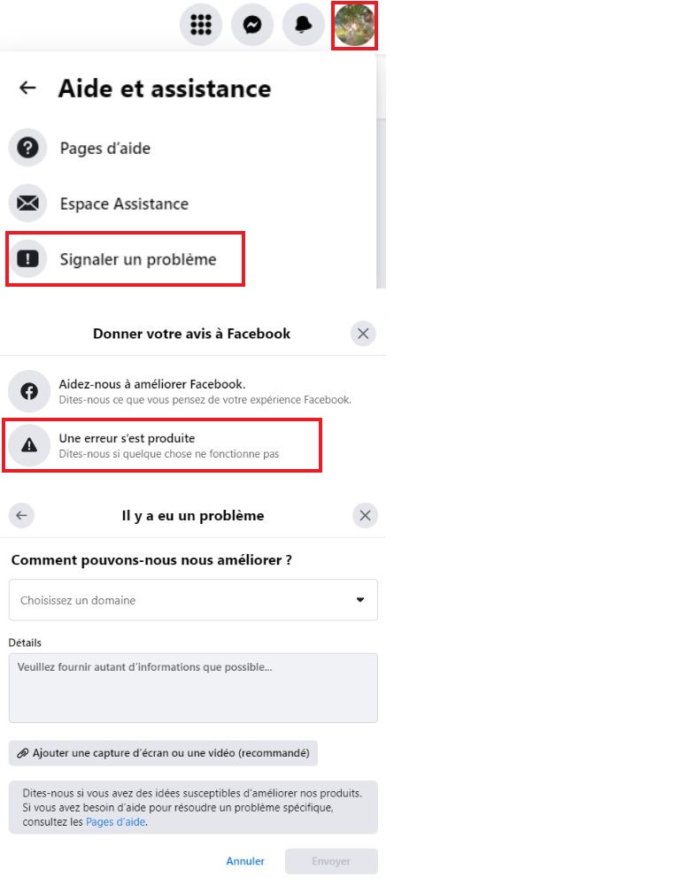 La marche à suivre pour signaler un bogue Facebook rencontré sur ordinateur.