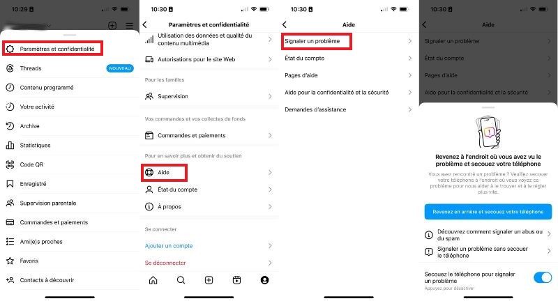 La marche à suivre pour signaler un bogue Instagram rencontré sur un téléphone.