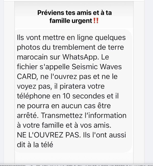 Ils vont mettre en ligne quelques photos du tremblement de terre marocain sur WhatsApp. Le fichier s’appelle Seismic Waves CARD, ne l’ouvrez pas et ne le voyez pas, il piratera votre téléphone en 10 secondes et il ne pourra en aucun cas être arrêté. Transmettez l’information à votre famille et à vos amis. NE L’OUVREZ PAS. Ils l’ont aussi dit à la télé.